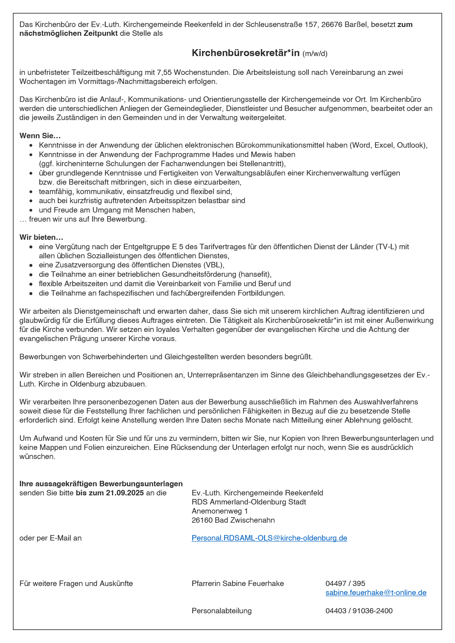 Wir, die Ev.-luth. Kirchengemeinde Reekenfeld mit 1.400 Gemeindegliedern, sind ein Landgemeinde. Mehrere Ortschaften und Dörfer (Reekenfeld, Kamperfehn, Kampe, Harkebrügge, Elisabethfehn-Süd, Lohe und Teile von Schwaneburger Moor, sowie Scharreler Damm) gehören zum Einzugsgebiet auf großer Fläche.